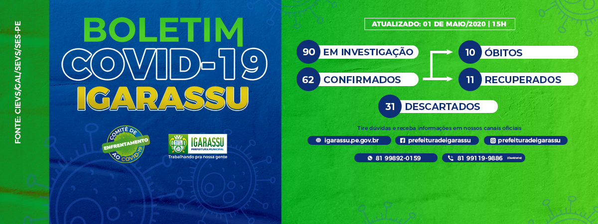 De acordo com boletim atualizado nesta sexta-feira (01) pelo Governo do Estado, Igarassu está atualmente com 62 casos confirmados do novo coronavírus. Até o momento, foram registrados 10 óbitos e 11 pessoas estão recuperadas.