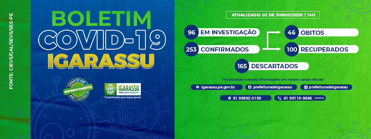 De acordo com boletim atualizado neste terça-feira (02) pelo Governo do Estado, Igarassu está atualmente com 253 casos confirmados do novo coronavírus. Até o momento, foram registrados 46 óbitos e 100 pessoas estão recuperadas.
