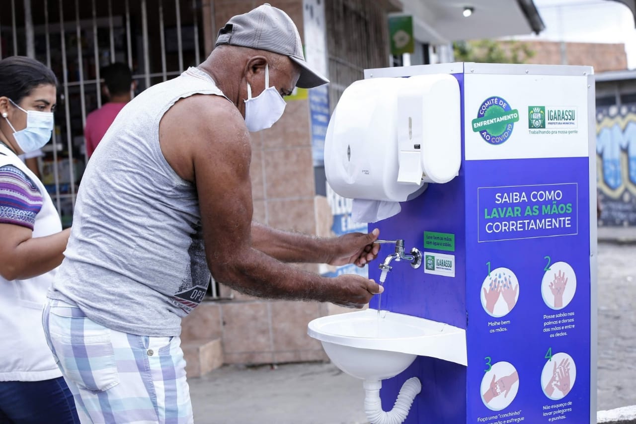 Para o enfrentamento à Covid-19, lavar as mãos é essencial neste momento.  Pensando nisso, a Secretaria  municipal de Desenvolvimento instalou nas principais entradas dos centros comerciais, lavatórios equipados com caixa d’água de 1.000 litros e quatro pias, cada um.